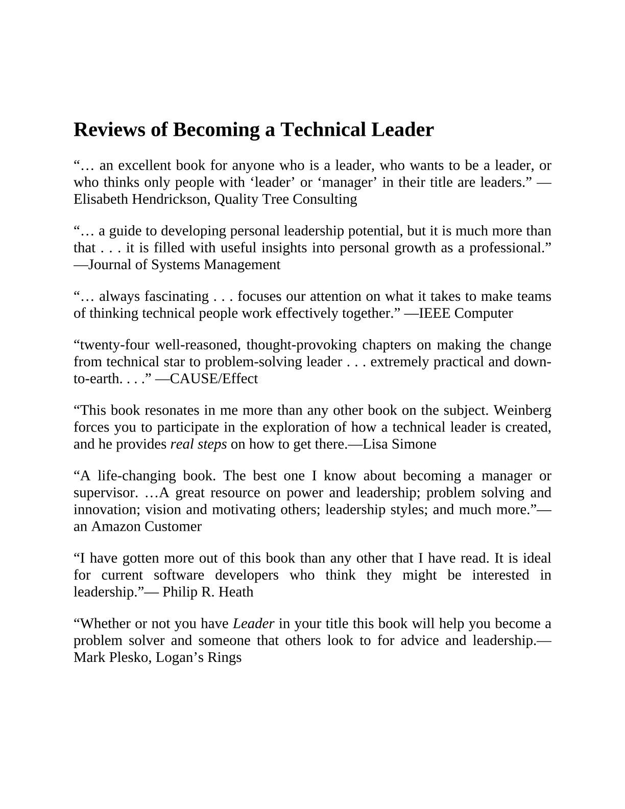 Becoming a Technical Leader is a personalized guide to developing the qualities that make a successful leader. It identifies which leadership skills are most effective in a technical environment and why technical people have characteristic trouble in making the transition to a leadership role. For anyone who is a leader, hopes to be one, or would like to avoid being one.