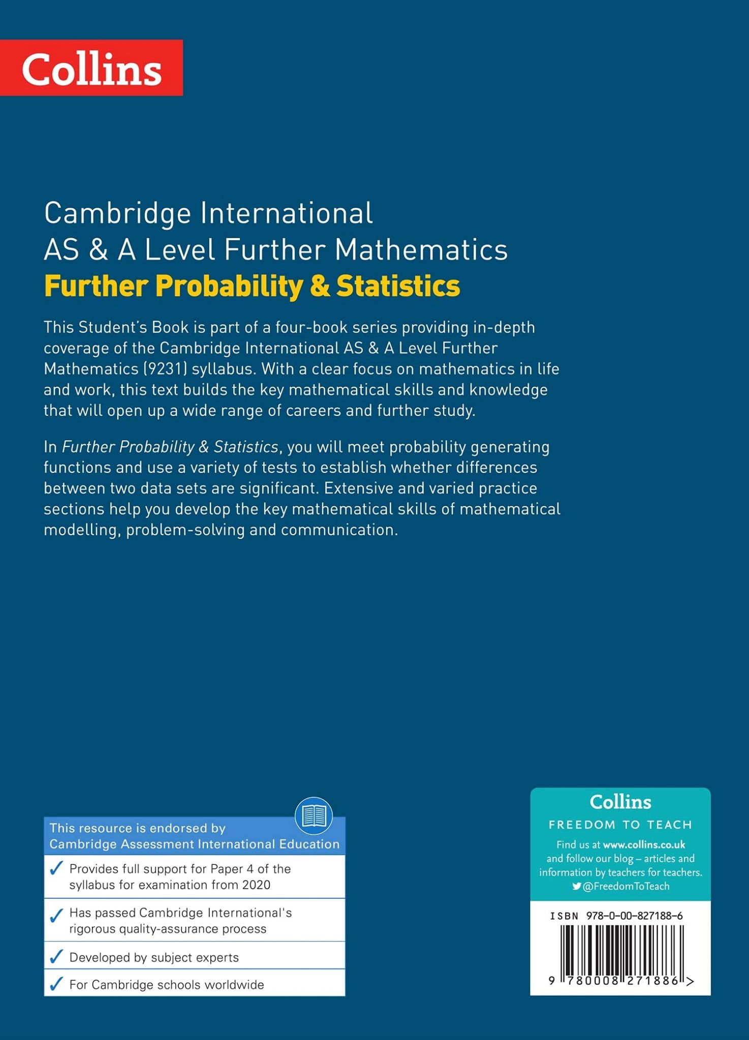 This book provides in-depth coverage of Further Probability & Statistics for Cambridge International AS and A Level Further Mathematics 9231, for examination from 2020 onwards. With a clear focus on mathematics in life and work, this text builds the key mathematical skills and knowledge that will open up a wide range of careers and further study.This student book is part of a series of nine books covering the complete syllabus for Cambridge International AS and A Level Mathematics (9709) and Further Mathematics (9231), for first teaching from September 2018. We are working with Cambridge International Examinations towards endorsement of this series.
