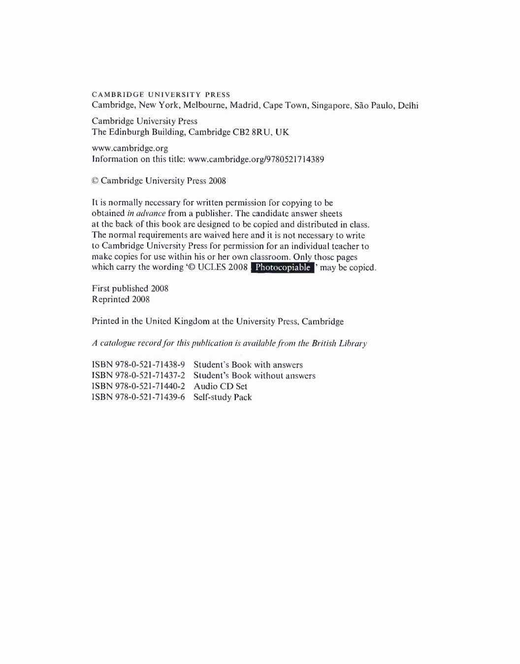 The Cambridge Preliminary English Test 5 practice tests provide candidates with an excellent opportunity to familiarise themselves with the 2004 PET exam and to practise examination techniques. The Student's Book contains practice material for Paper 1 (Reading and Writing) and Paper 2 (Listening), along with attractive colour visual material for Paper 3 (Speaking), enabling students to prepare thoroughly for the paired Speaking test.