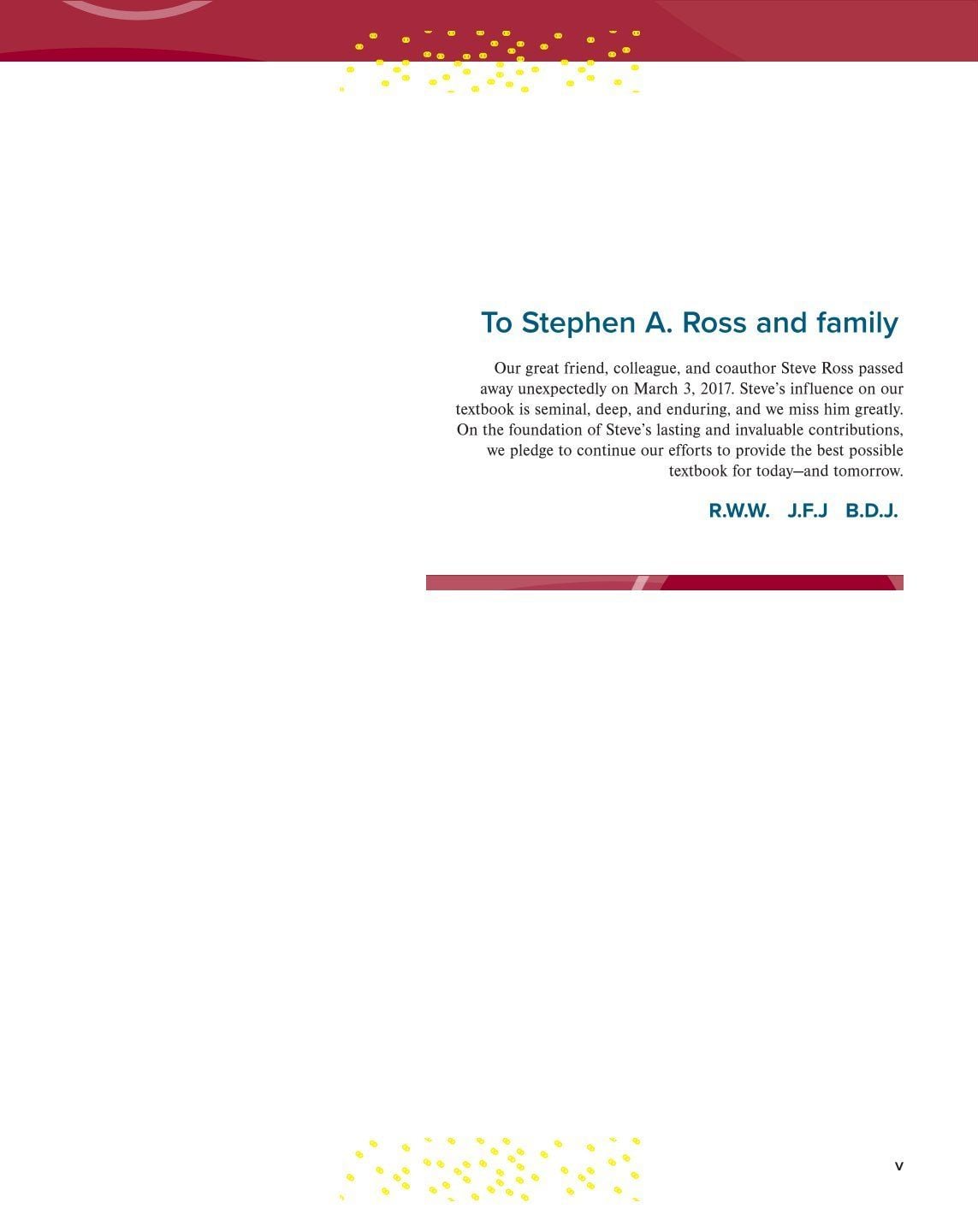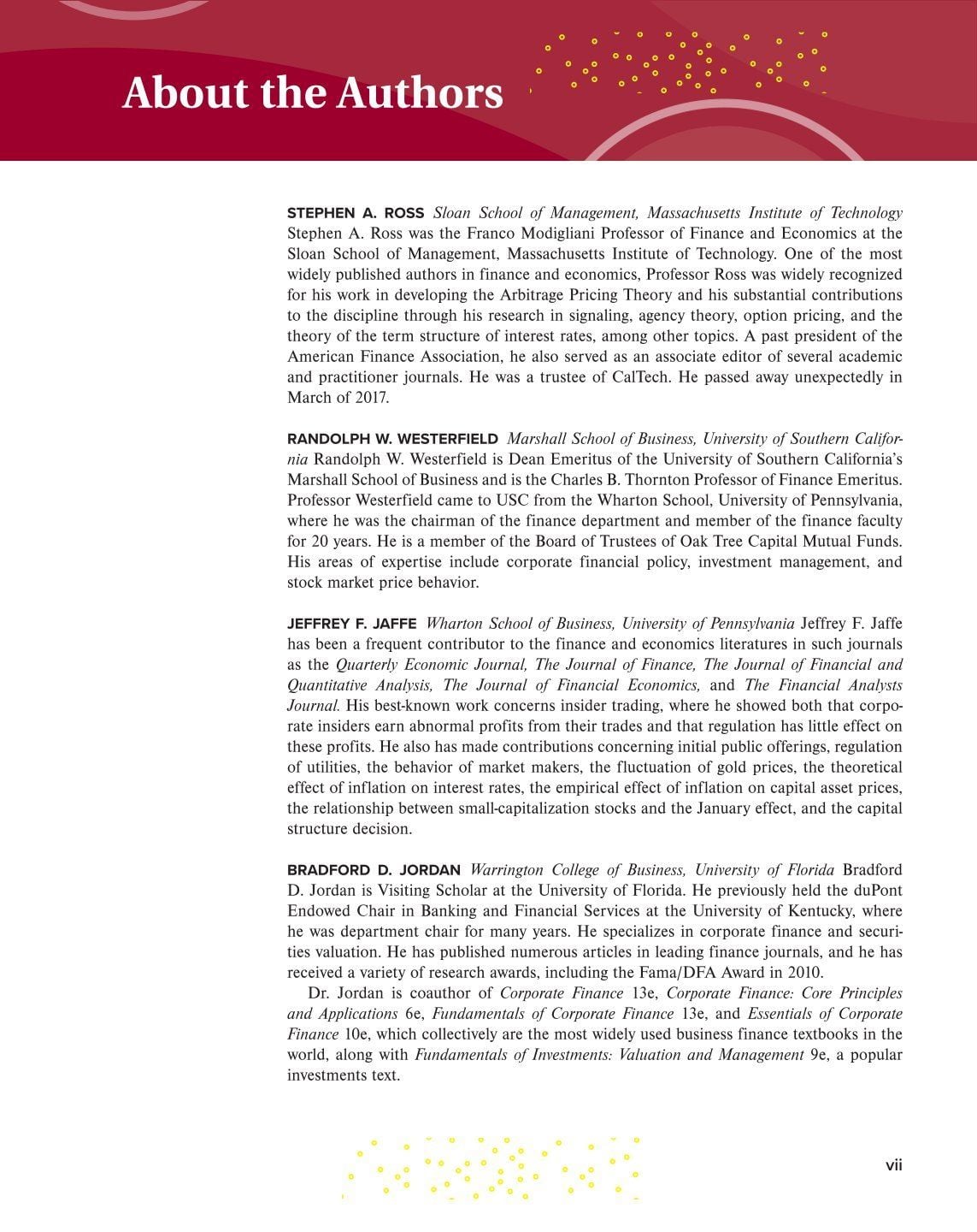 Corporate Finance, by Ross, Westerfield, Jaffe, and Jordan, was written for the corporate finance course at the MBA level and the intermediate course in many undergraduate programs. The text emphasizes the modern fundamentals of the theory of finance while providing contemporary examples to make the theory come to life. The authors aim to present corporate finance as the working of a small number of integrated and powerful intuitions rather than a collection of unrelated topics.
