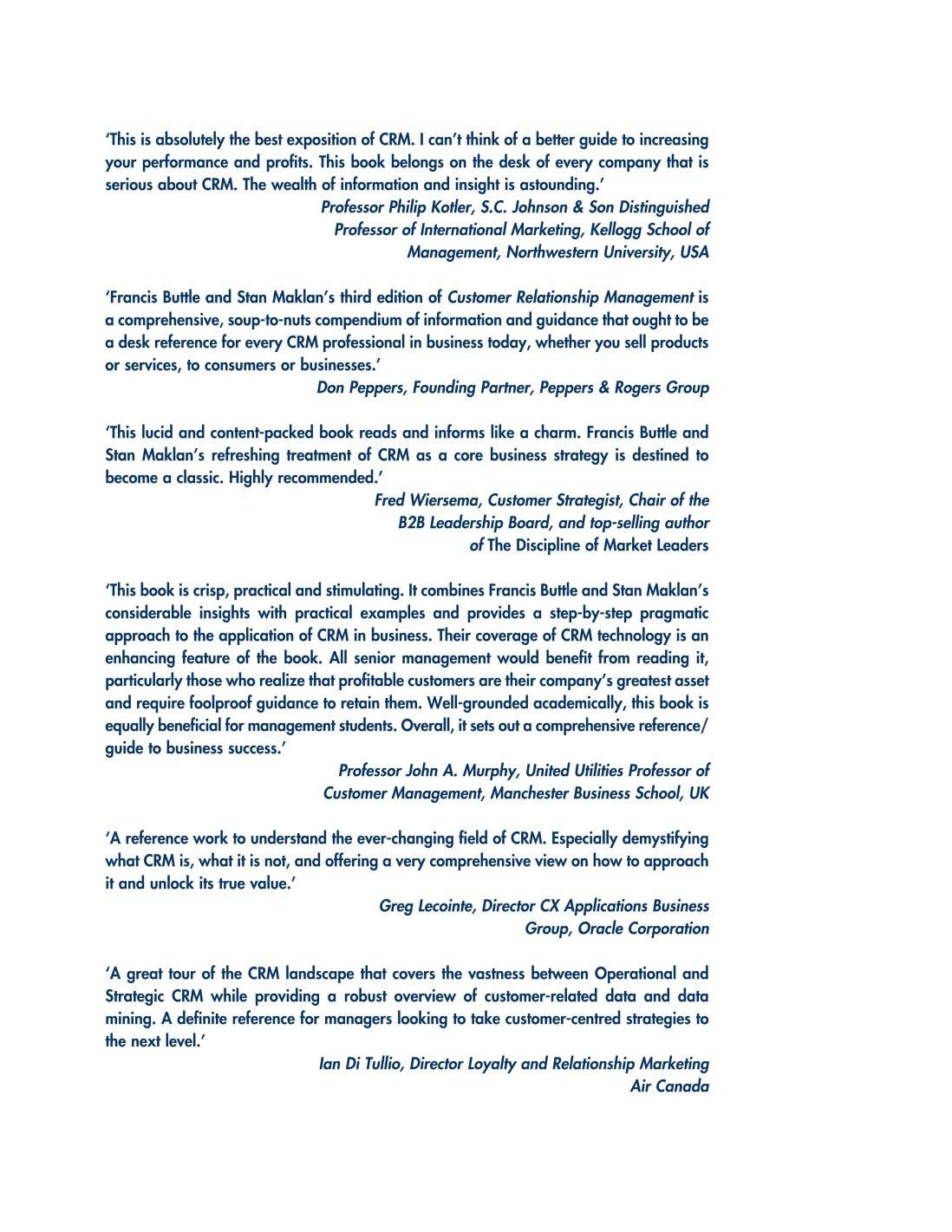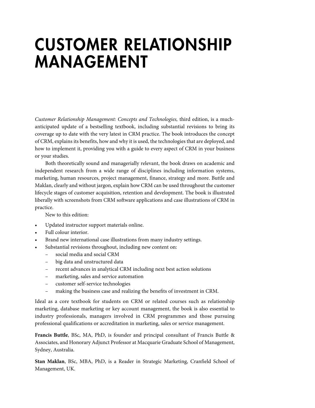 Both theoretically sound and managerially relevant, the book draws on academic and independent research from a wide range of disciplines including IS, HR, project management, finance, strategy and more. Buttle and Maklan, clearly and without jargon, explain how CRM is used throughout the customer life cycle stages of customer acquisition, retention and development. The book is illustrated liberally with screenshots from CRM software applications and case illustrations of CRM in practice.
