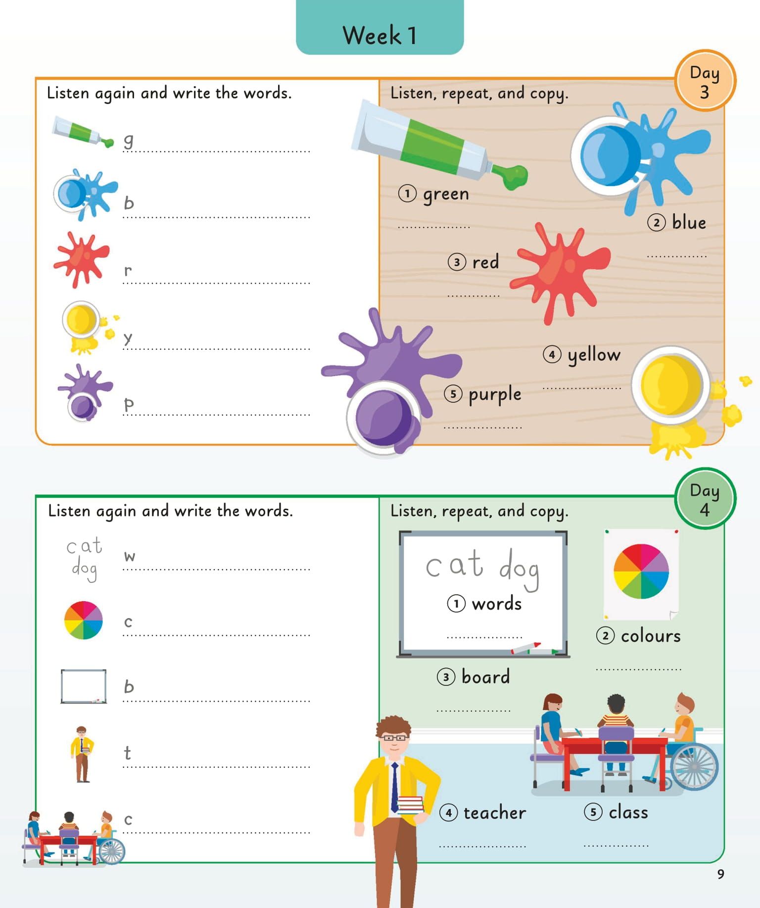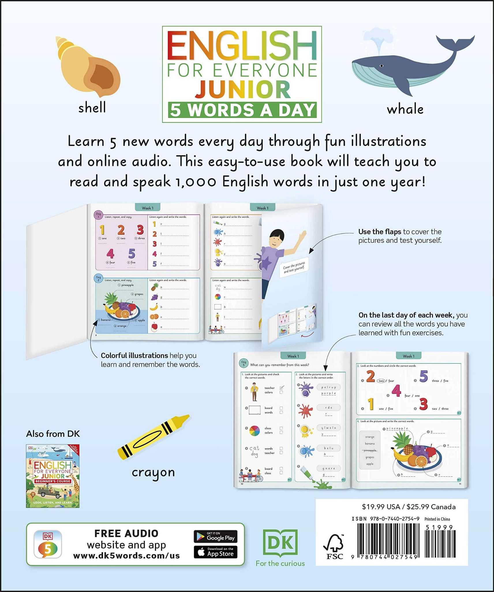 Packed full of fun and useful everyday vocabulary, this visual reference book will capture the imagination of little learners and encourage a love for learning their first English words. The book presents your child with 5 new words to learn and practice each day for four days, then tests these words through a variety of interactive exercises on day five. Over the course of one year, your child will build up a vocabulary of more than 1000 English words.