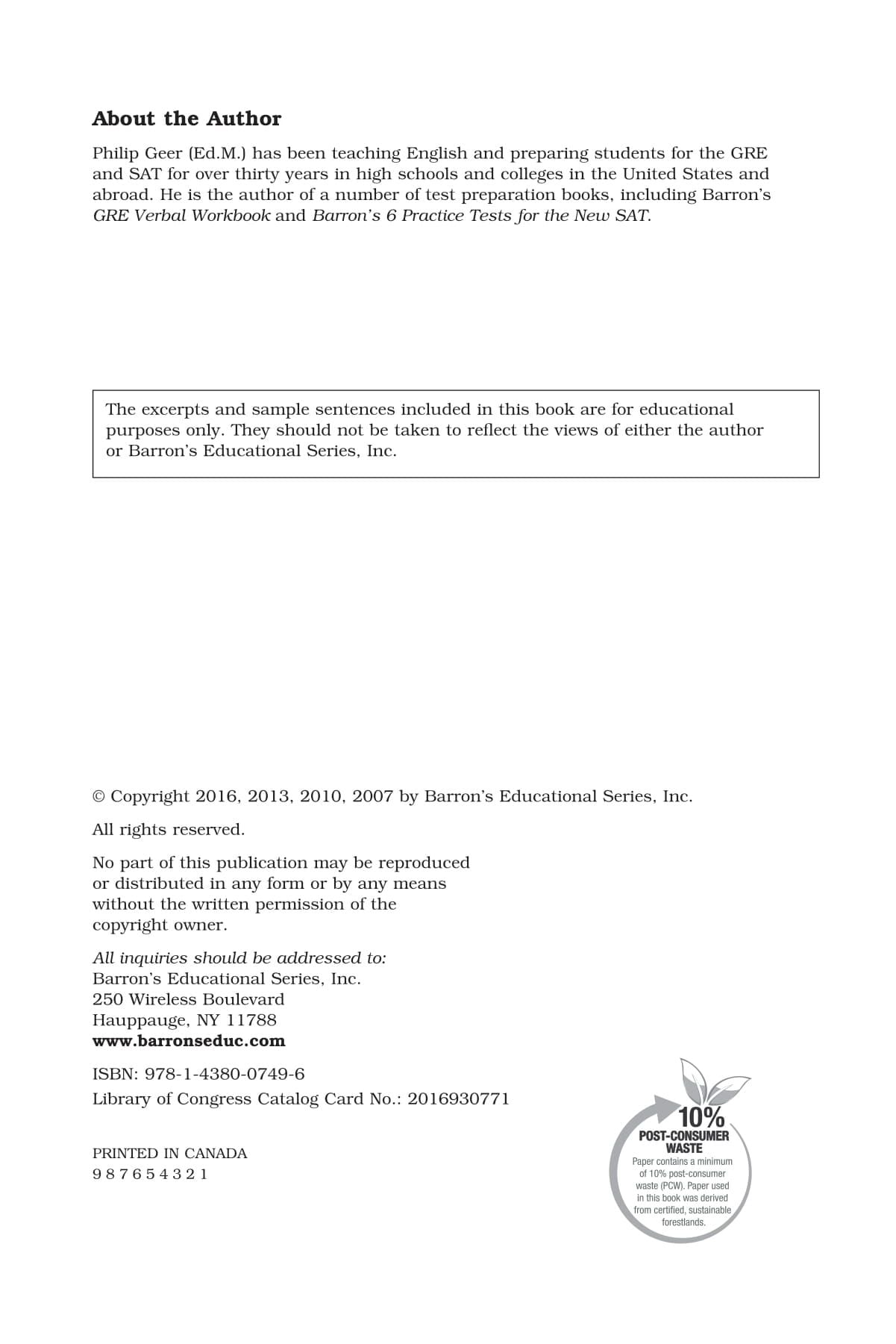 An extensive working vocabulary is a prerequisite for test-taking success on the Graduate Record Exam. This book presents 800 graduate-level words with definitions that frequently appear on the exam. Words are used in different contexts to familiarize test takers with their many variations. The book's additional features include a pre-test that helps to diagnose weaknesses, a lengthy word list with extensive practice exercises, and a chapter that discusses and analyzes essential word roots. The book concludes with a post-test to assess progress. Answers are provided for all exercises and for all questions in the pre- and post-test.