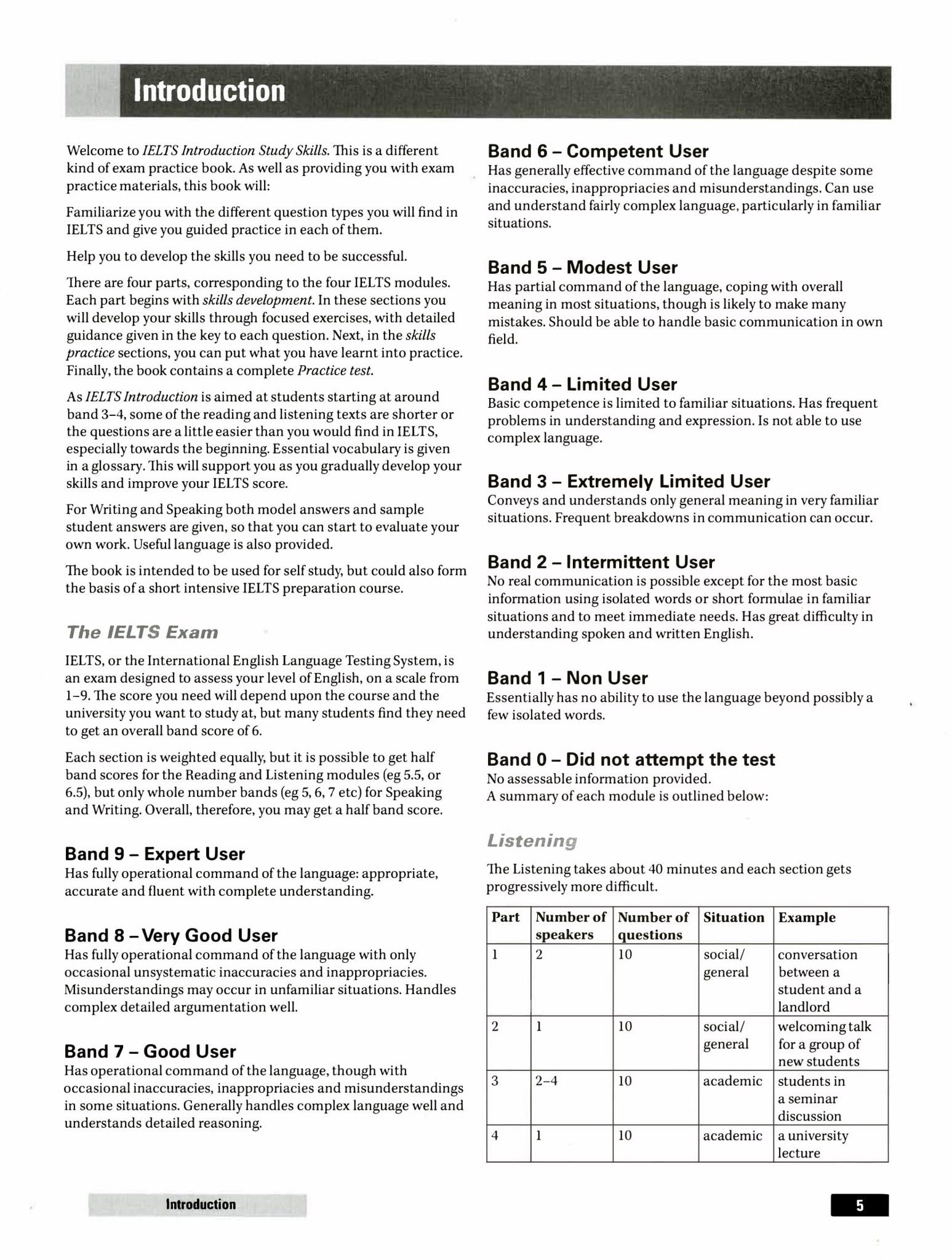 IELTS Introduction is a brand new course designed specifically for low-level students wishing to take the IELTS exam. The 12 units aim to train students within an IELTS band of 3-4 in the skills required. Each unit contains a wide range of IELTS tasks, with exercises aimed at developing listening skills, speaking skills, reading skills as well as providing extensive writing practice; all of the material any beginner level student will need for IELTS success! The book adopts a guided, step-by-step approach to tasks so that lower-level students are gently introduced to what is needed in the IELTS exam. There are shorter reading passages and listening tasks with IELTS-type questions to familiarise students with what to expect in the exam. The Student's Book is also complemented with IELTS Introduction Study Skills which includes an audio CD and extra tests for additional exam practice. KEY FEATURES - Extra Audio CD for further listening practice - Full IELTS practice exam