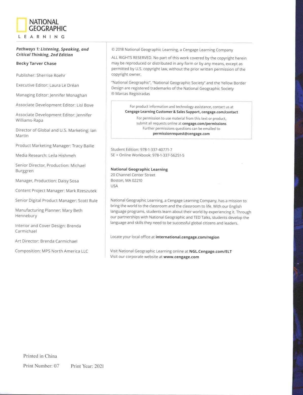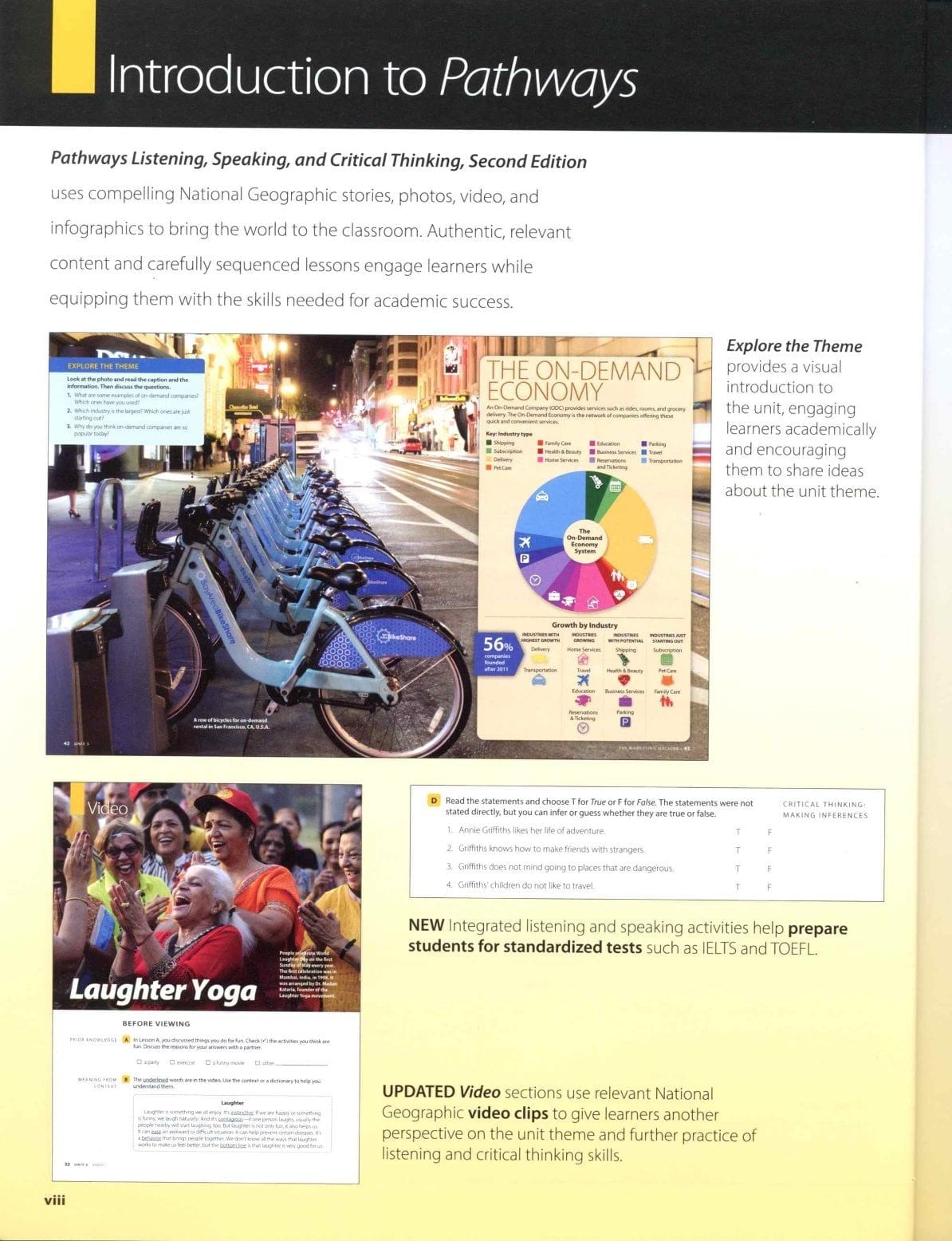 Pathways, Second Edition, is a global, five-level academic English program. Carefully-guided lessons develop the language skills, critical thinking, and learning strategies required for academic success. Using authentic and relevant content from National Geographic, including video, charts, and other infographics, Pathways prepares students to work effectively and confidently in an academic environment.