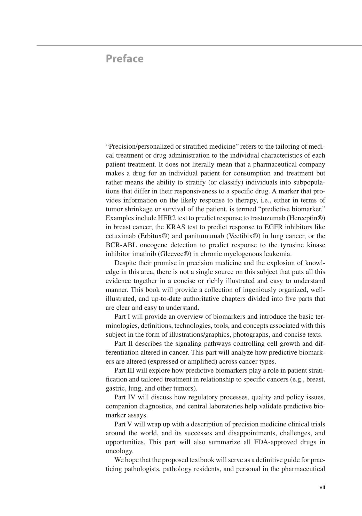 “Precision/personalized or stratified medicine” refers to the tailoring of medical treatment or drug administration to the individual characteristics of each patient treatment. It does not literally mean that a pharmaceutical company makes a drug for an individual patient for consumption and treatment but rather means the ability to stratify (or classify) individuals into sub-populations that differ in their responsiveness to a specific drug. A marker that provides information on the likely response to therapy, i.e., either in terms of tumor shrinkage or survival of the patient is termed “predictive biomarker”. Despite their promise in precision medicine and the explosion of knowledge in this area, there is not a single source on this subject that puts all this evidence together in a concise or richly illustrated and easy to understand manner.