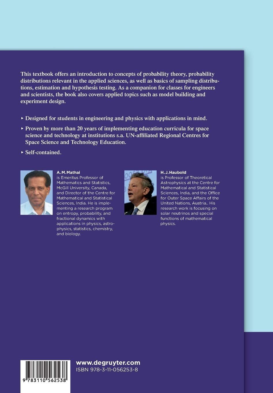 This textbook offers an introduction to concepts of probability theory, probability distributions relevant in the applied sciences, as well as basics of sampling distributions, estimation and hypothesis testing. As the basis for courses on space and atmospheric science, remote sensing, geographic information systems, meteorology, climate and satellite communications at UN-affiliated regional centers, various applications of the formal theory are discussed as well. These include applied topics such as model building and experiment design.