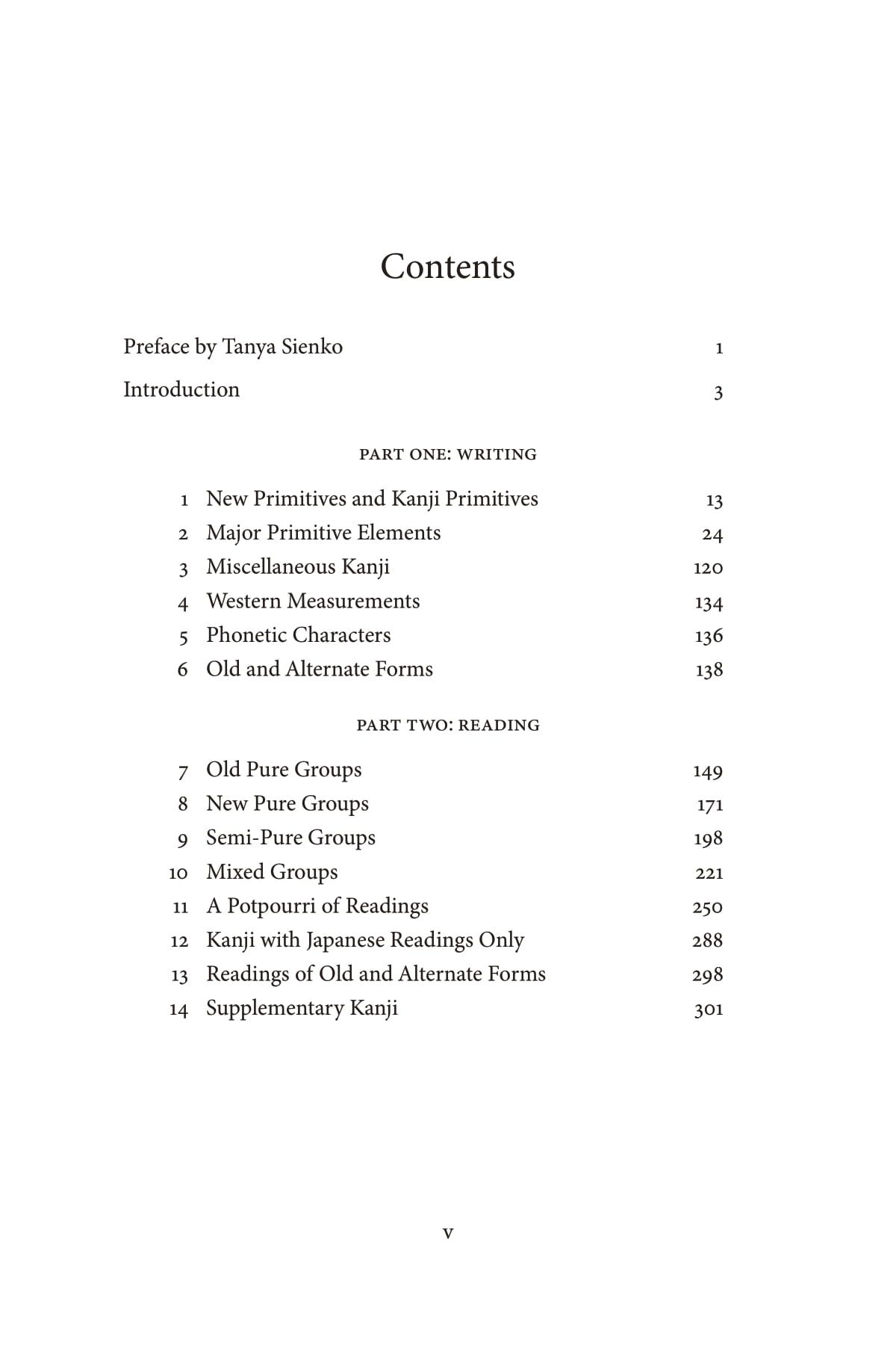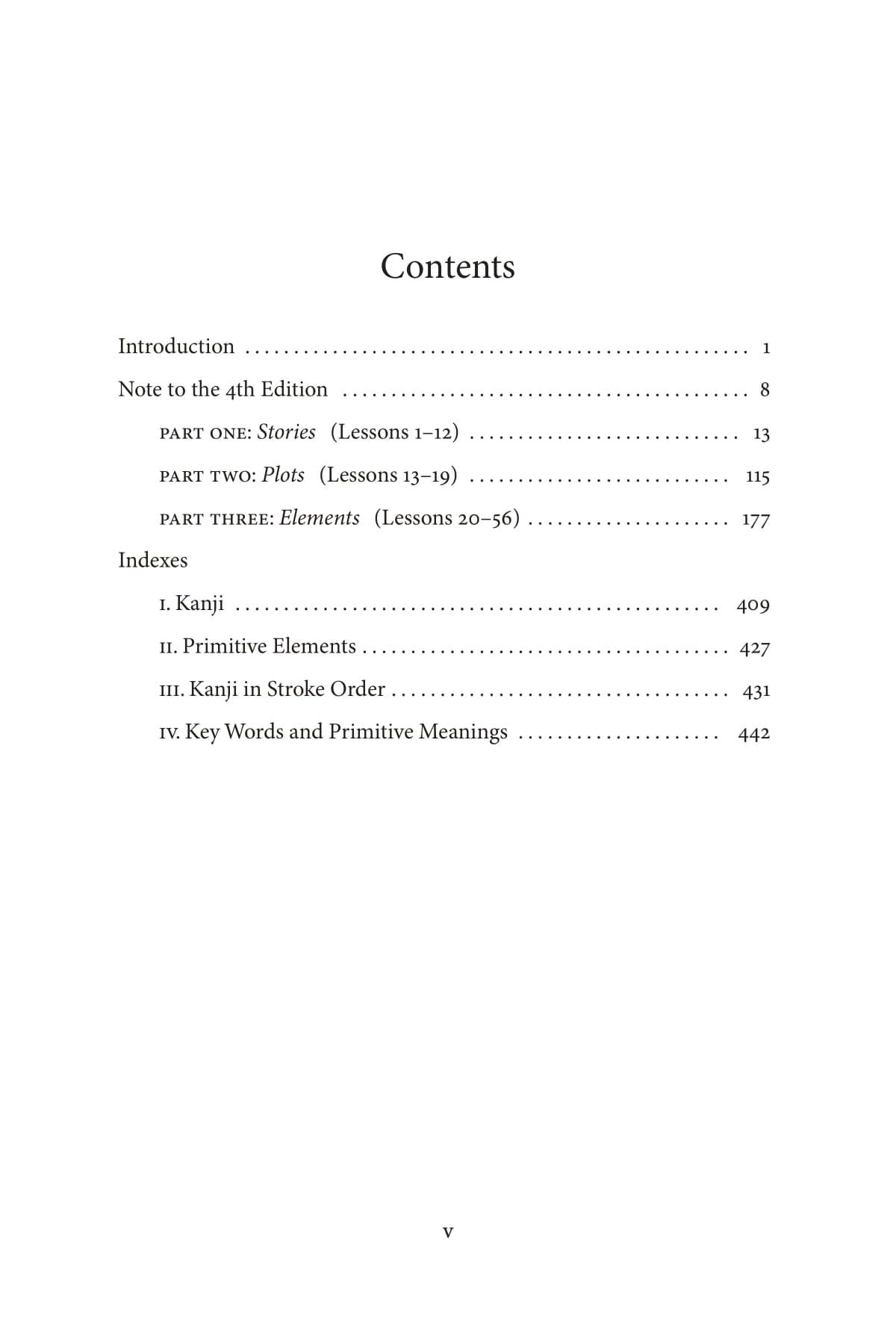 The author begins with writing the kanji because―contrary to first impressions―it is in fact simpler than learning how to the pronounce them. By ordering the kanji according to their component parts or “primitive elements,” and then assigning each of these parts a distinct meaning with its own distinct image, the student is led to harness the powers of “imaginative memory” to learn the various combinations that make up the kanji. In addition, each kanji is given its own key word to represent the meaning, or one of the principal meanings, of that character. These key words provide the setting for a particular kanji’s “story,” whose protagonists are the primitive elements.
