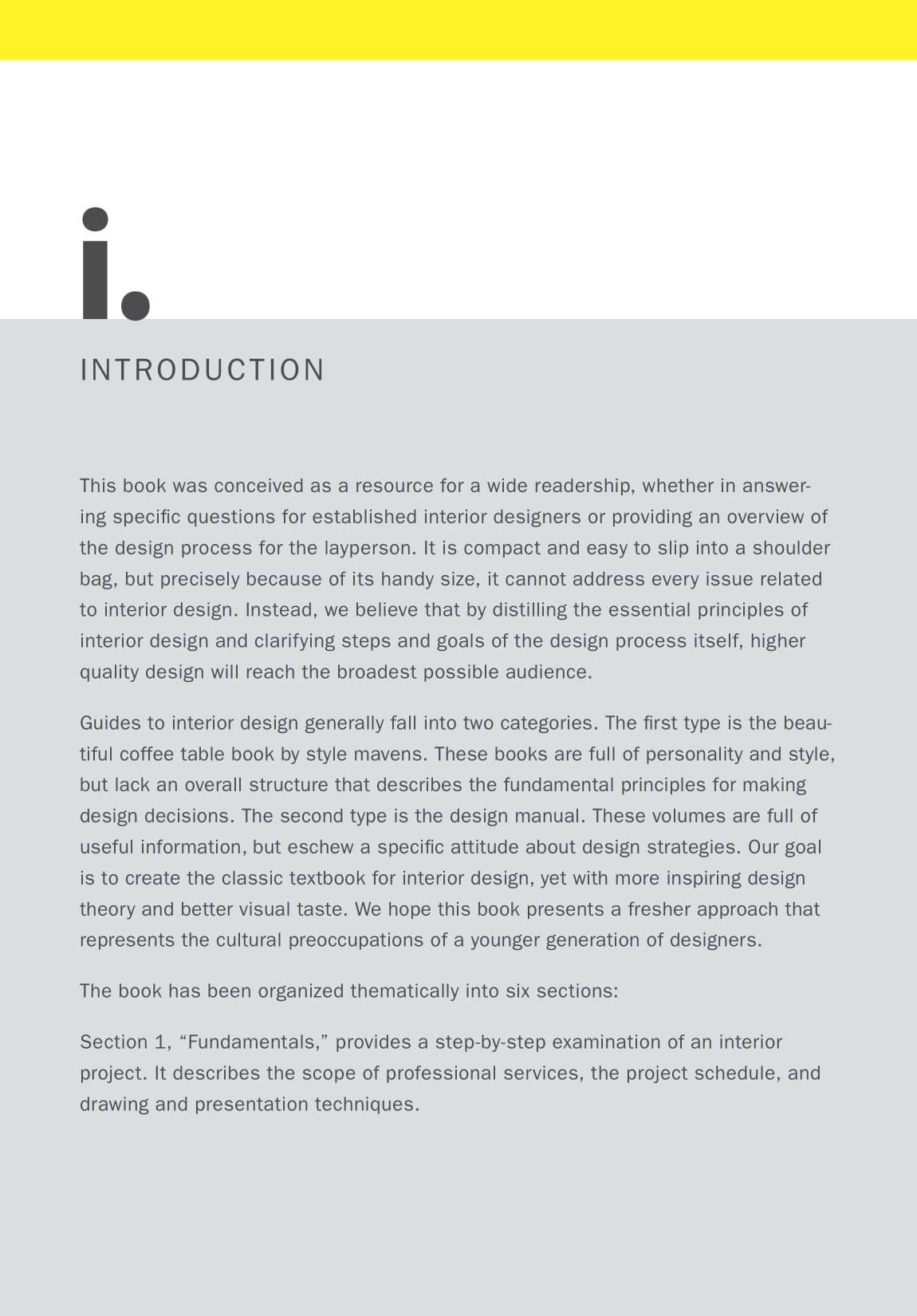 —Fundamentals provides a step-by-step overview of an interiors project, describing the scope of professional services, the project schedule, and the design and presentation tools used by designers.